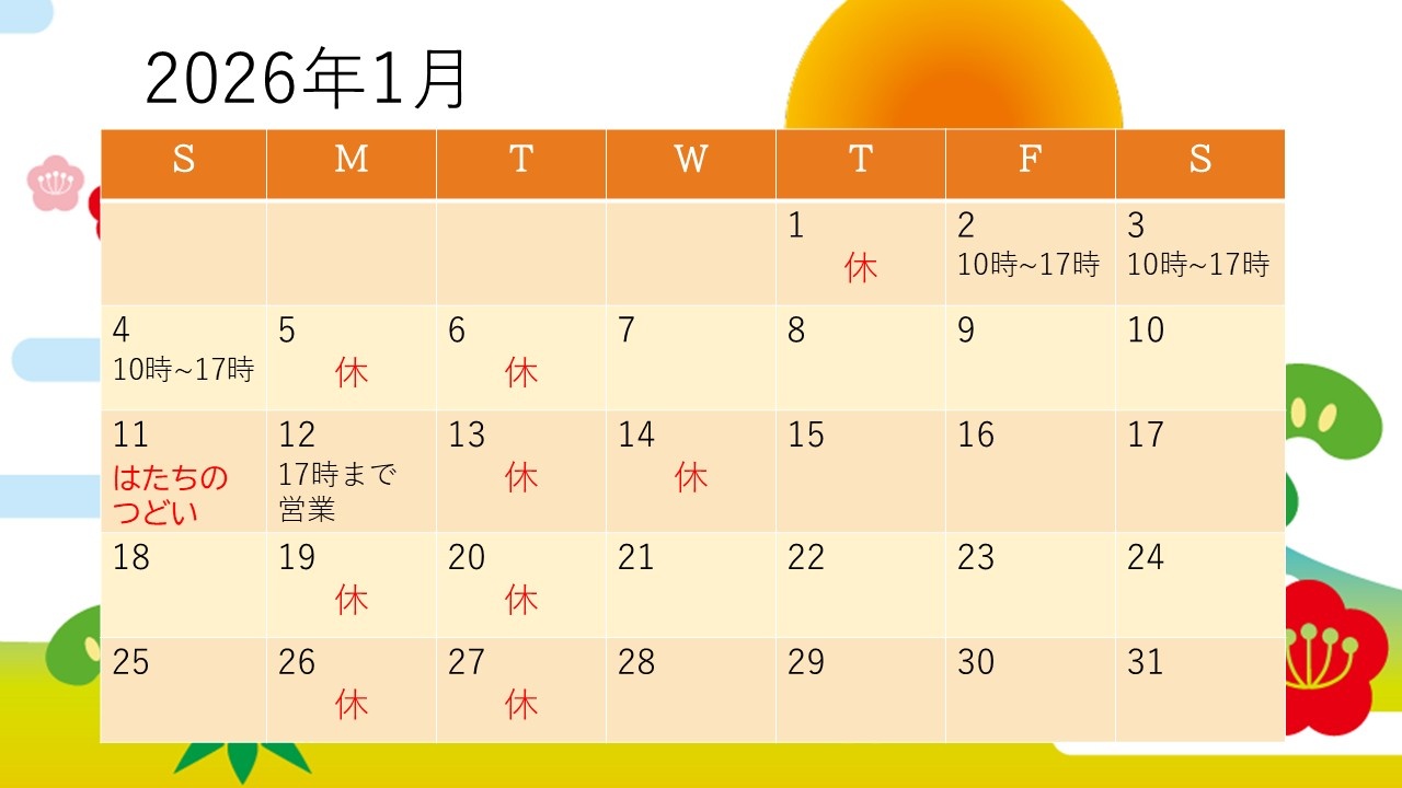 2025年12月28日(日) 年末年始営業日時のお知らせ 年末年始の営業日時のお知らせです。 12月中は通常営業いたします。 1月1日㈭ 休み 1月2日㈮~4日㈰ 10時~17時 営業 なお、12日㈪ははたちのつどいの翌日になりますので 月曜日ですが17時まで営業します。 13日㈫14日㈬はお休みいたします。 よろしくお願いいたします。